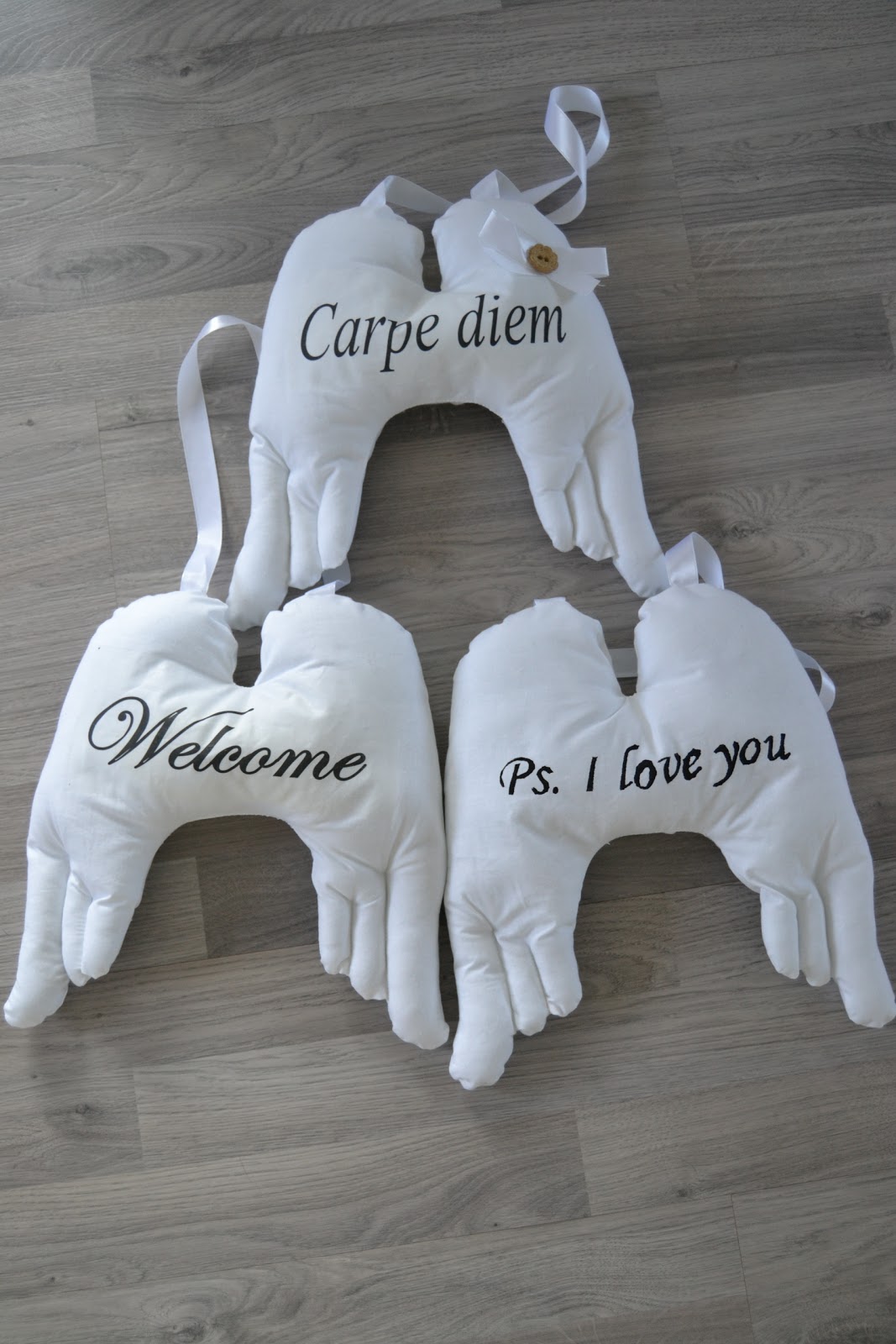 Mustaa saumurin lankaa ootellessa ja nimilappuja (jotka olen tilannu jo 2vk sitten) aattelin ommella muutaman enkelin siiven jollakin kivalla tekstillä. Harmi ettei ollu ohutta helminauhaa, sekin olis kivasti käyny näihin.